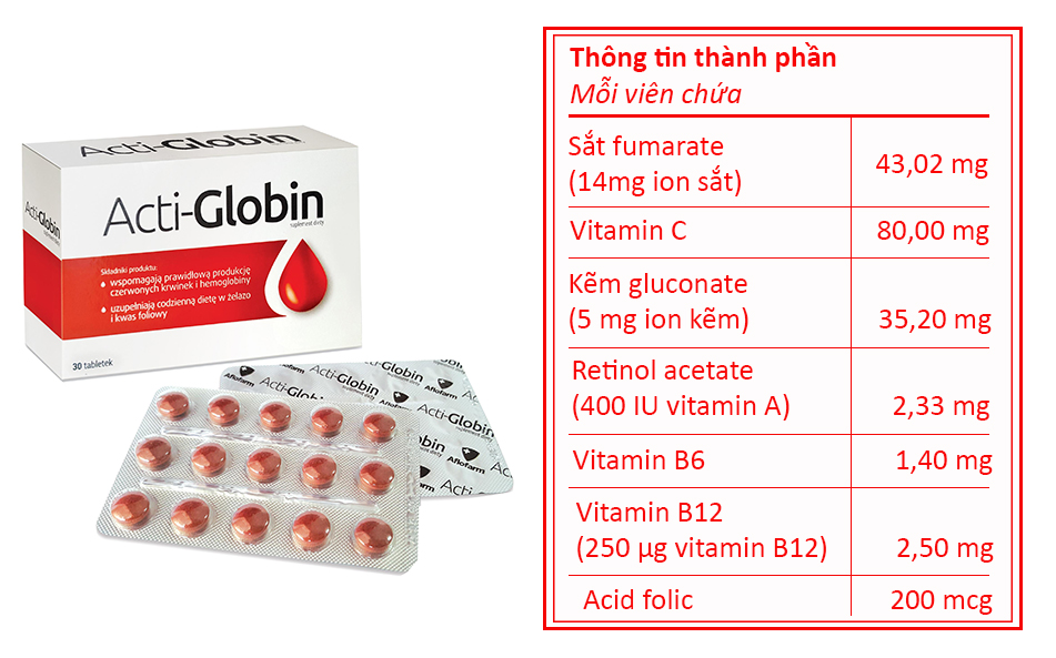 Acti-globin là một sản phẩm bổ sung sắt tổng hợp chất lượng cao từ nhà máy Aflofarm Balan, được thiết kế đặc biệt để cung cấp các chất dinh dưỡng quan trọng như: sắt, acid folic, kẽm và các vitamin A, B6, B12, C cho cơ thể. Acti-globin không chỉ bổ sung sắt hỗ trợ quá trình tạo hồng cầu, axit folic phòng ngừa dị tật thần kinh ở thai nhi. Kẽm hỗ trợ tăng sức đề kháng, giúp quá trình mang thai, sinh nở được thuận lợi.