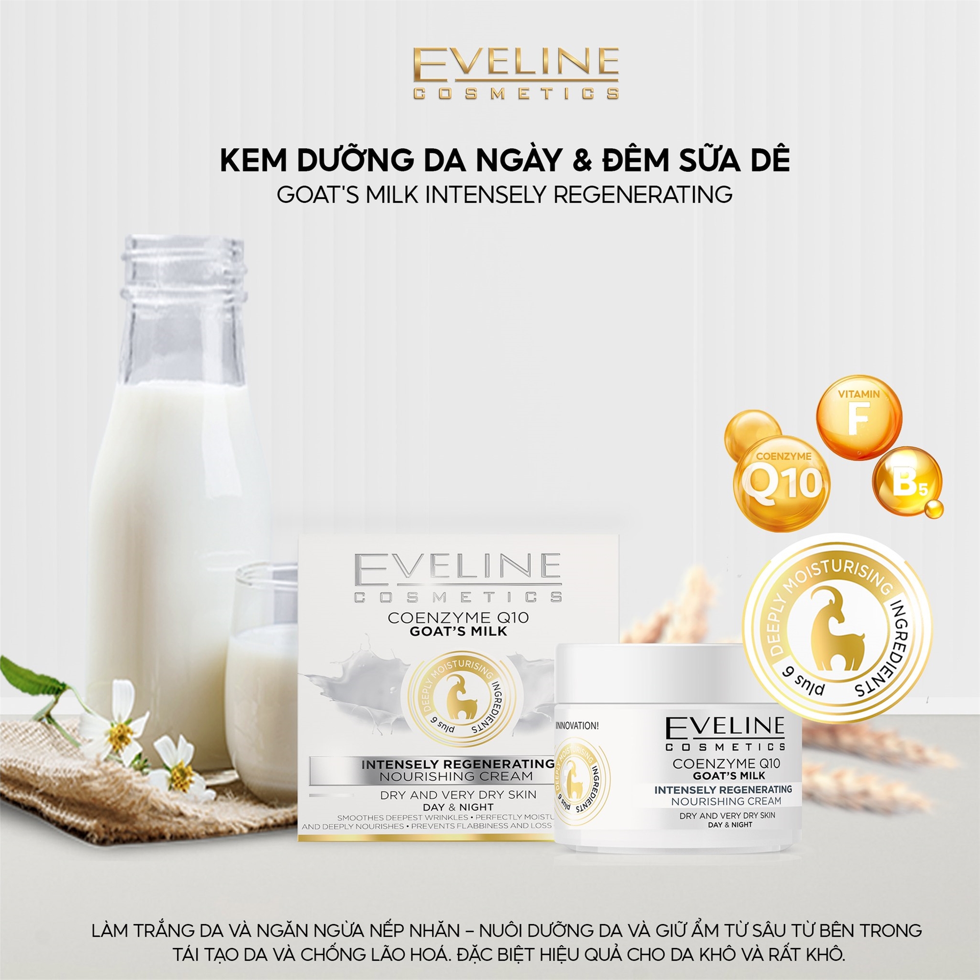 Bạn đang tìm kiếm một giải pháp hoàn hảo để cung cấp cho làn da của bạn những dưỡng chất cần thiết để trở nên trắng sáng, mịn màng và tươi trẻ? Sản phẩm Kem Dưỡng Da Sữa Dê Eveline Với Coenzyme Q10, Sữa Dê, Bơ Cacao, Axit Hyaluronic, Vitamin A, D-Panthenol, Ure, Allantoin, Vitamin F. Cho Làn Da Trắng Sáng, Tươi Trẻ, Hũ 50ml được thiết kế đặc biệt để mang lại sự trắng sáng và tươi trẻ cho làn da của bạn.