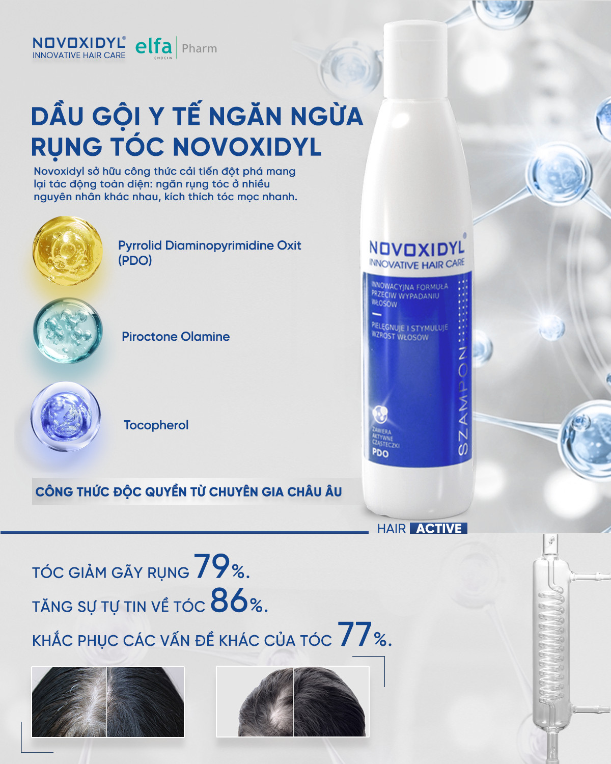 Dầu gội trị rụng tóc, kích thích mọc tóc Novoxidyl là sản phẩm đột phá trong việc giải quyết tình trạng tóc rụng và kích thích mọc tóc mới. Thông thường dầu gội chỉ giúp làm sạch tóc nhưng với Novoxidy thì các thành phần hoạt tính được tích hợp, thấm vào chân tóc trong lúc gội đầu, giúp ngăn chặn tình trạng tóc rụng mà còn thúc đẩy quá trình mọc tóc con, mang lại mái tóc chắc khỏe và diện mạo trẻ trung. Sản phẩm chứa các thành phần hoạt tính giúp làm sạch da đầu, ngăn ngừa nhiễm nấm, vi khuẩn và viêm chân tóc, đồng thời cung cấp dưỡng chất nuôi dưỡng và bảo vệ tóc cho tóc bóng mượt.