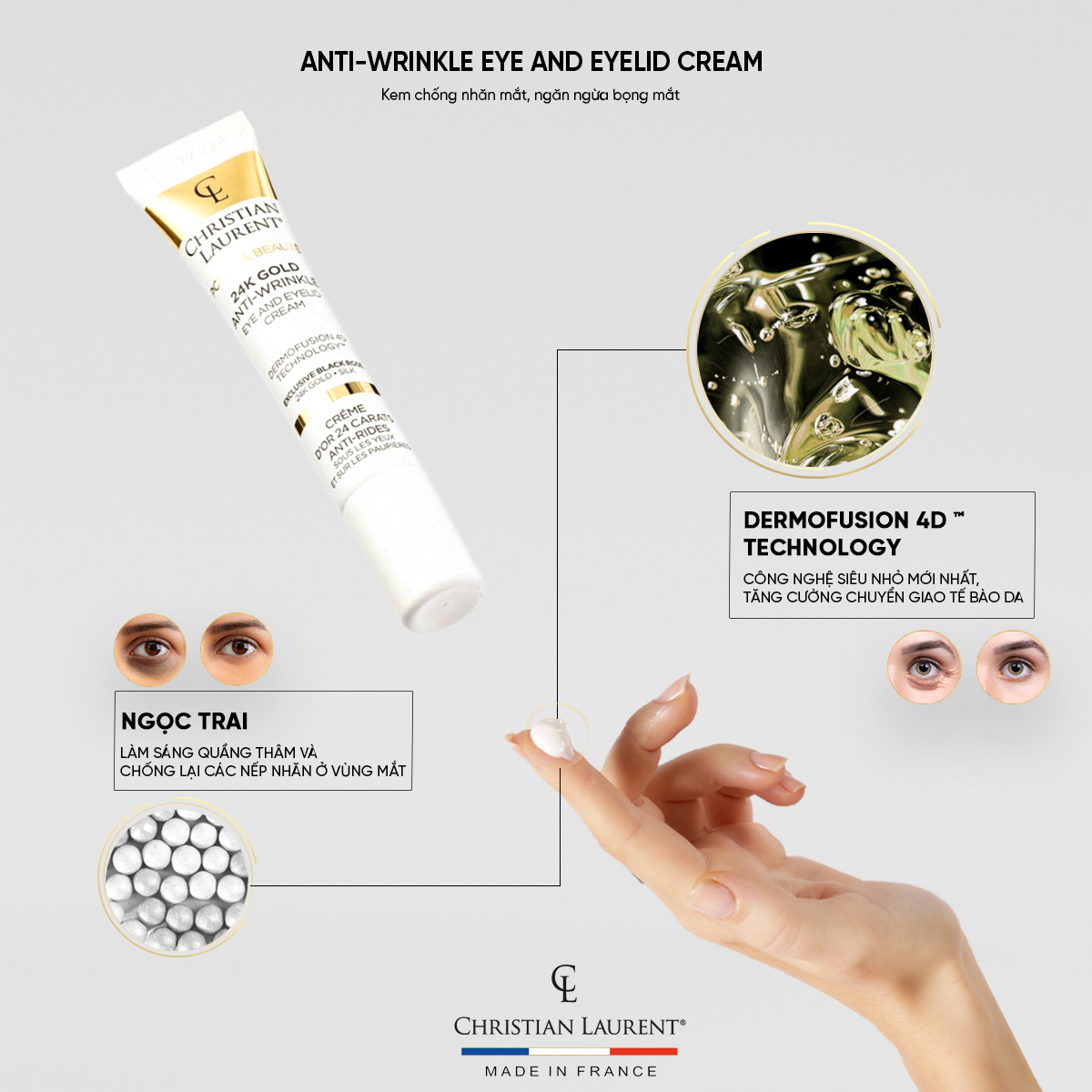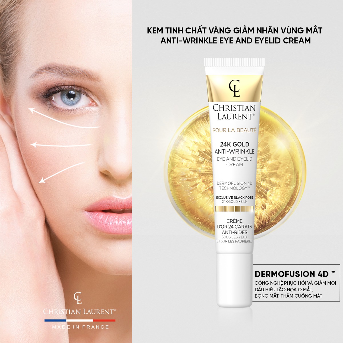 Kem chống nhăn vùng mắt Gold Christian Laurent là một lựa chọn tuyệt vời với những nguyên liệu cao cấp nhất để sử dụng mỗi ngày cho vùng da quan trọng nhất trên khuôn mặt mỗi người, giúp bạn duy trì vẻ trẻ trung và rạng rỡ cho vùng da mắt của mình. Hãy cho phép sản phẩm này trở thành một phần không thể thiếu trong quy trình chăm sóc da hàng ngày của bạn.