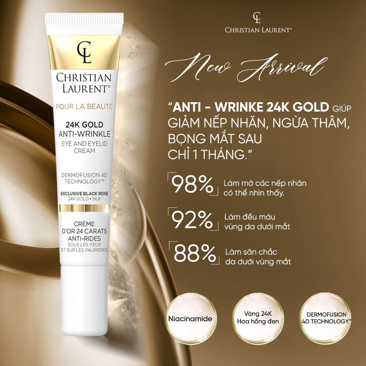 Kem chống nhăn vùng mắt Gold Christian Laurent là một sản phẩm chăm sóc da vượt trội, đặc biệt thiết kế để giảm nhăn, chống lão hóa và tái tạo vùng da quanh mắt. Sự kết hợp độc đáo của các nguyên liệu cực cao cấp như hoa hồng đen độc quyền, tinh chất vàng 24k và bột ngọc trai mang lại những lợi ích tuyệt vời cho vùng da quanh mắt mắt.