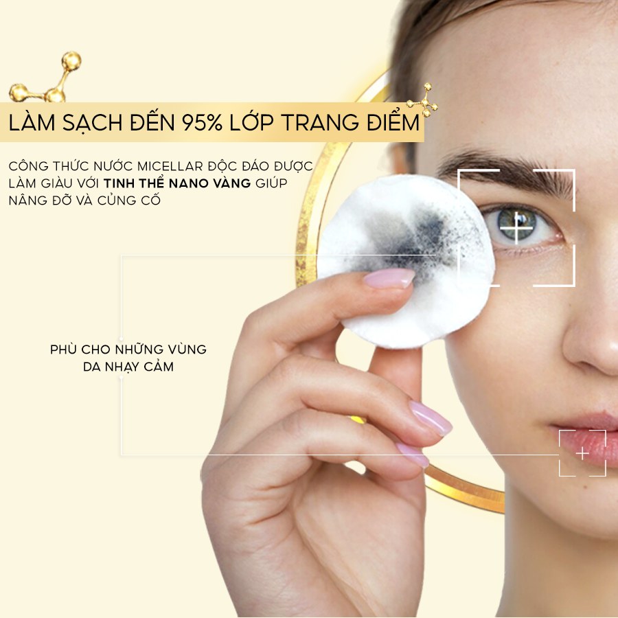 1. Tẩy sạch lớp trang điểm và bụi bẩn: Nước tẩy trang Gold Christian Laurent tẩy sạch mọi vết trang điểm, kể cả lớp trang điểm lâu trôi, giúp da trở nên thông thoáng và sạch sẽ.