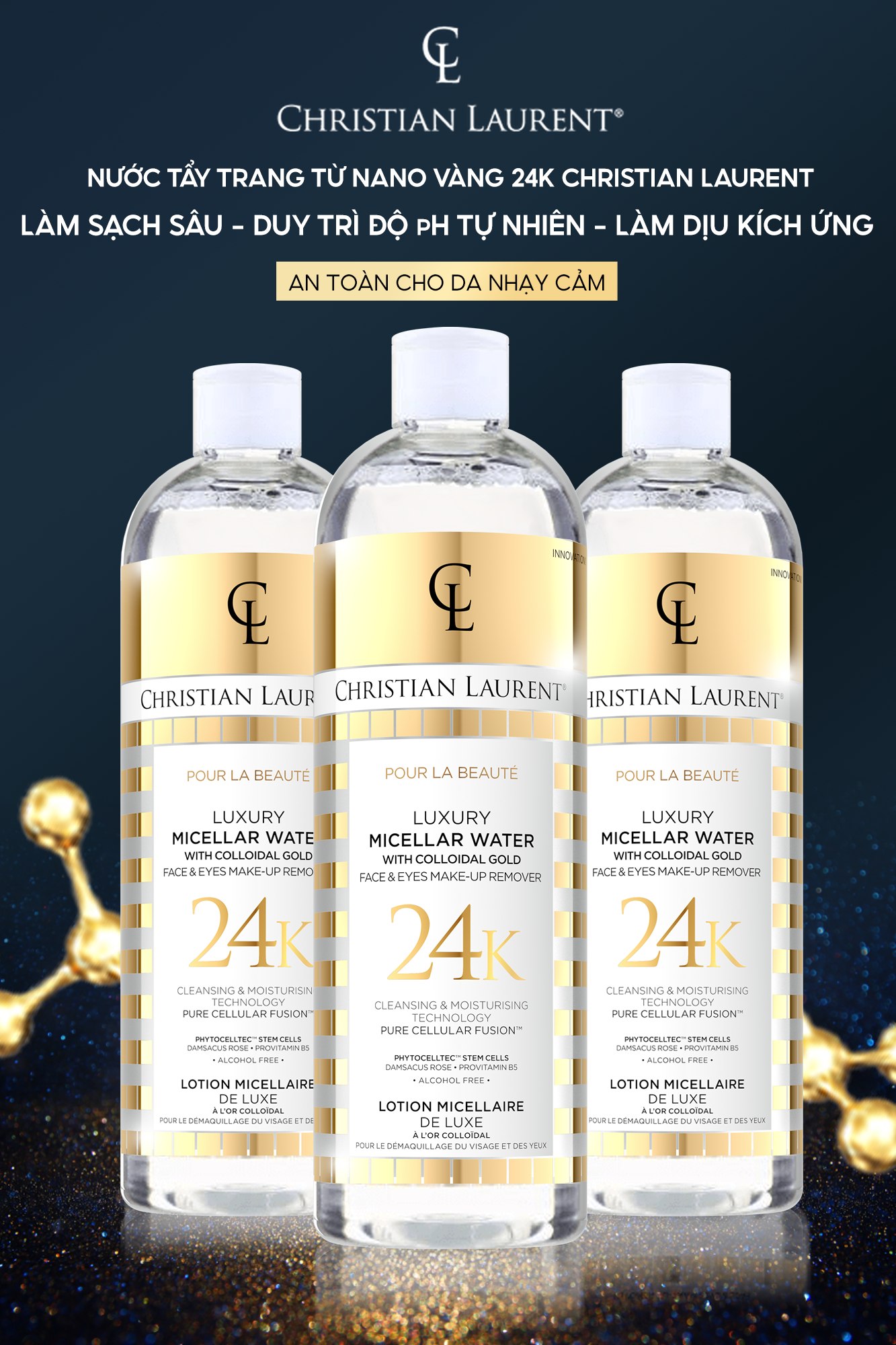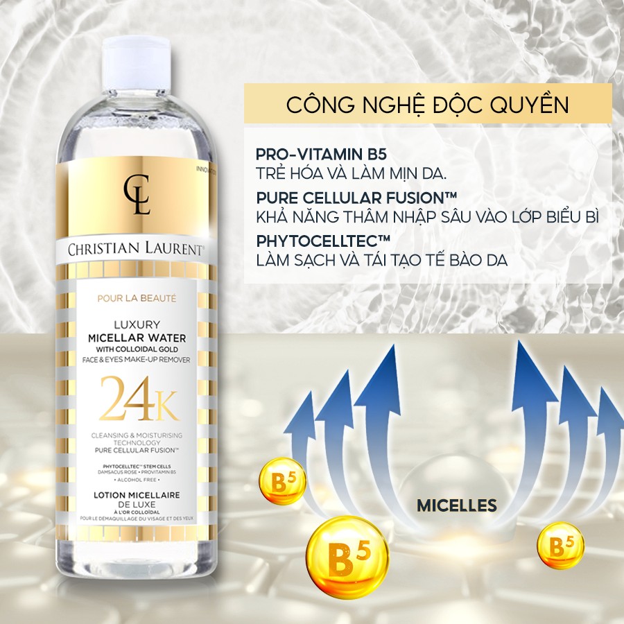 Nước tẩy trang Gold Christian Laurent là sản phẩm chất lượng cao giúp tẩy sạch lớp trang điểm lâu trôi và bụi bẩn tích tụ trên da, mang lại làn da thông thoáng và sạch sẽ. Với công thức độc đáo, sản phẩm không chỉ làm sạch hiệu quả mà còn giúp hạn chế tình trạng bít tắc lỗ chân lông. Nước tẩy trang này cũng dùng được cho vùng mắt và môi, giúp tẩy sạch mascara và son môi một cách nhẹ nhàng. Ngoài ra còn có tác dụng tái tạo da, dịu kích ứng..